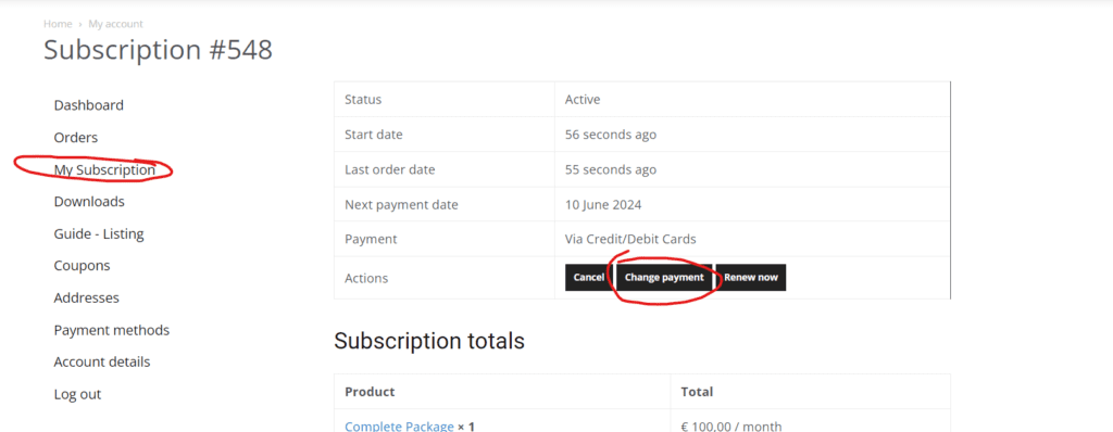 You can also change payment your payment method here by clicking on change payment or you can do this by clicking on the menu item: payment methods: